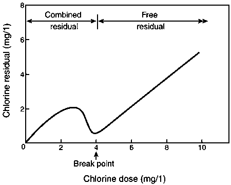 The type of chlorine dosing normally applied to piped water supply systems is referred to as breakpoint chlorination. Sufficient chlorine is added to satisfy all of the chlorine demand and then sufficient extra chlorine is added for the purposes of disinfection. Figure 1 shows the breakpoint chlorination curve. It indicates the effect of adding more chlorine to water which contains an initial ammonia nitrogen content of 1 mg/l.
