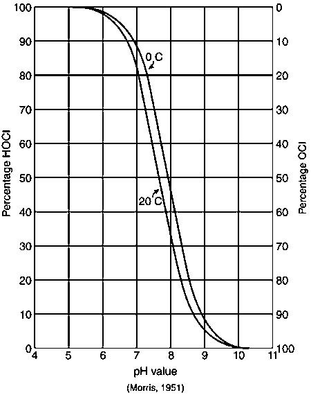 It is undissociated hypochlorous acid which acts as a disinfectant. The equilibrium between undissociated hypochlorous acid, hydrogen ions and hypochlorite ions depends on pH. At high pH (alkaline conditions, pH greater than 8), the dissociated forms predominate and at low pH (acidic conditions) undissociated hypochlorous acid predominates. For this reason disinfection with chlorine is more efficient at lower pH values and a pH of less than 8 is recommended for disinfection. Pure chlorine gas from a cylinder tends to decrease the pH of the water slightly; hypochlorite tends to increase water pH a little.