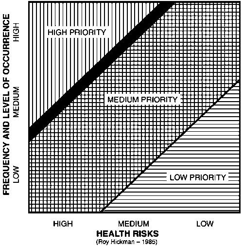 There are generally insufficient resources available to deal with all the contaminants that may occur in drinking-water in a country, and it will be necessary to establish priorities. Figure 1 depicts a qualitative prioritisation scheme for setting drinking-water standards. Standards should be set at first for those contaminants that occur frequently and at significant concentrations in drinking-water and that have the greatest health impact. Microbiological contaminants belong to this category.