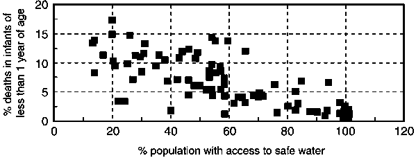 · semi-quantitative presentation has been done by Morris: this showed that risk of infectious water-borne disease is high where chlorination not practised and this decreases sharply with even minimal levels of chlorination, though can never reach zero risk | |