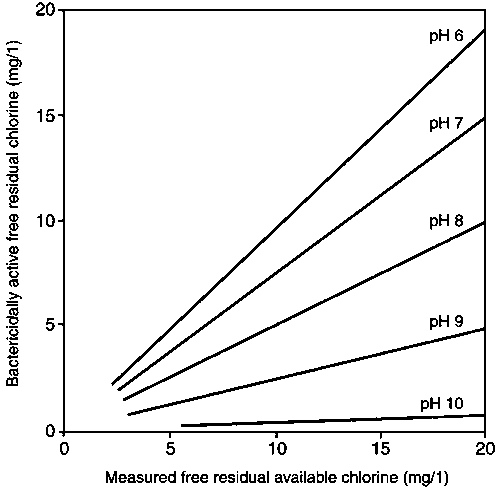 The value of the acid ionization constant is about 3 × 10-8. As shown in Figure 1, at 20°C and pH 7.5, there is an equal distribution of HOCl and OCl-. At pH 8, about 30% of the free chlorine is present as HOCl, and at pH 6.5, 90% is present as HOCl (Morris, 1982). The term free chlorine refers to the sum of hypochlorous acid and hypochlorite ion. Since HOCl is a considerably more efficient disinfectant than OCl-, and free chlorine, even as hypochlorite, is more effective than combined chlorine (e.g. chloramines), the Guidelines recommend that disinfection be carried out at pH less than 8 and at a free chlorine concentration ³ 0.5 mg/litre.