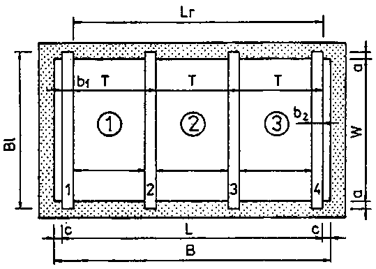 Lr length required for the calculation, BL length of wooden beam, T pitch size (beam spacing), B clear width of the room, L length to be distributed, a bearing length, b1, b2 width of wooden beams, c minimum distance of wooden beams from the wall, 1, 2, 3, 4 wooden beams