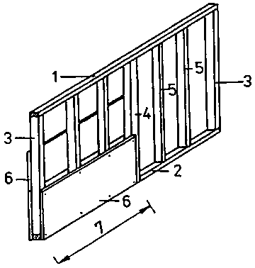 1 head runner, 2 foot runner, 3 wall post, 4 joint post, 5 post, 6 wall covering, 7 length of surface covering material
