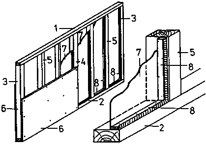 1 head runner, 2 foot runner, 3 wall post, 4 joint post, 5 post, 6 wall covering, 7 sound-insulating mat, 8 wooden strip