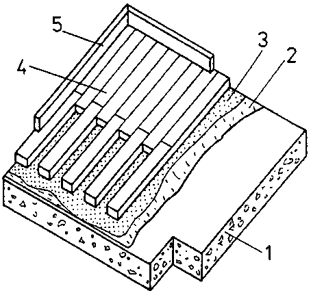 1 solid subfloor, 2 precoating/adhesive, 3 bituminous felt/adhesive, 4 parquets-fillets, 5 skirting board