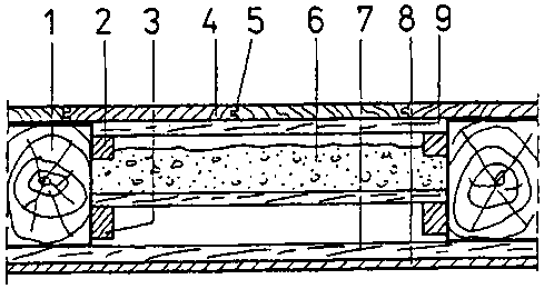 1 beam, 2 supporting laths. 3 laths, 4 parquet deals, 5 tongue, 6 filler, 7 timbering, 8 lathwork/plaster, 9 planed boarding fitted between the beams
