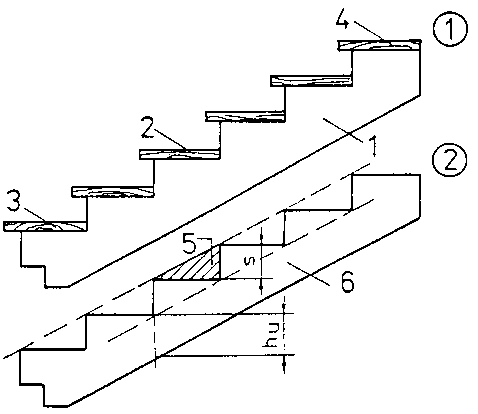 sectional view of saddle stairs 1 stair string, 2 step, 3 stair foot