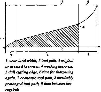 a result of mechanical wear, thermal load and electroerosion; the wear-land width is the measurable variable. This mark characterizes the size of the regrind, because the cutting edge has to be set back during sharpening so far that the wear mark disappears; wear mark for steel cutting edges s 0.3 mm. |