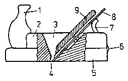 1 handle, 2 plane stock, 3 plane hole, 4 opening in the plane face, 5 face, 6 impact button, 7 hand guard, 8 plane iron with flap, 9 wedge