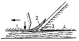 1 pre-splitting, 2 wood shaving, 3 plane iron cutting edge, 4 workpiece (wood)