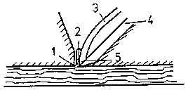 1 breaking edge of face opening, 2 shaving, 3 flap, 4 plane iron, 5 breaking edge at flap