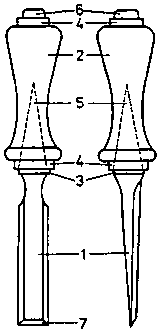 1 blade, 2 haft, 3 shoulder (collar), 4 clamp (metal rings), 5 tang, 6 button for beating, 7 cutting edge