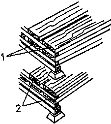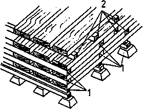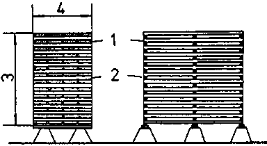 block-type pile 1 unedged-sawn boards, 2 pile strips, 3 bottom boards, 4