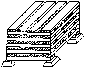 Edged boards or squared timbers of equal length are piled up at right angles to each other without any pile strips.