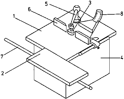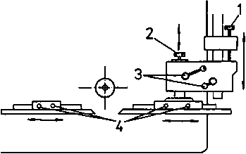 1 machine table, 2 movable table, 3 cutter arbor with tool, 4 machine frame, 5 top bearing support with top bearing,. 6 guide rule with stop faces, 7 guide tube, 8 exhaust facility