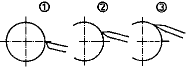 Here the wood processing direction constantly changes. Mainly used are the roughing and finishing tools. The support strip is so set that the tool cutter engages at centre of rotation level. Initially the roughing tool is employed for preturning. The tool is moved from the workpiece centre to the edge and back again. Thereby the roughing tool with cavity is somewhat inclined to the respective direction of feed.