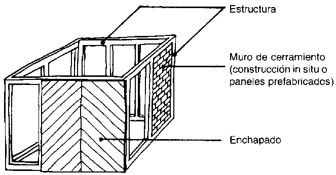 La estructura de esqueleto consta de piezas angulares, verticales y horizontales (ejem. madera, bambú, concreto reforzado), que son unidas para formar la estructura de soporte de carga de la edificación. El espacio entre ellas puede permanecer abierto o puede ser llenado con materiales de construcción para muros in situ (ejem. muro de mampostería, arcilla y paja) o paneles prefabricados (ejem. madera y tableros compuestos, paneles de ladrillo, concreto y ferrocemento). Estos ayudan a mantener la estructura sin distorsiones. Las estructuras bien arriestrada también pueden llevar enchapados ligeros (ejem. tablas de bambú y madera contrachapeada, fibra concreto, pizarras).