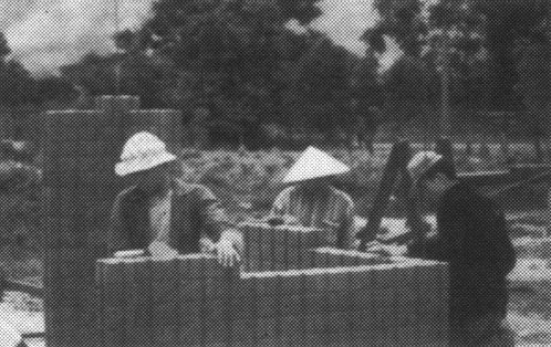 Relleno ambas caras se cubren con una tablazón de tiras de bambú - alt: la cara interior se cubre con tablero de bambú, se coloca la tierra entre las alineaciones interior y exterior y se compacta ligeramente.