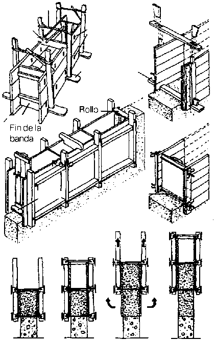 A continuación se ilustran diferentes tipos de encofrados. El encofrado normalmente se mueve en forma horizontal después que se completa cada sección. Para evitar grietas horizontales en las juntas de construcción (ya que cada hilada seca en lapsos de tiempo distintos), se ha desarrollado en el Politécnico de Kassel, Alemania, un sistema de encofrados que se desliza hacia arriba (Bibl. 02.28, Vol. 2)