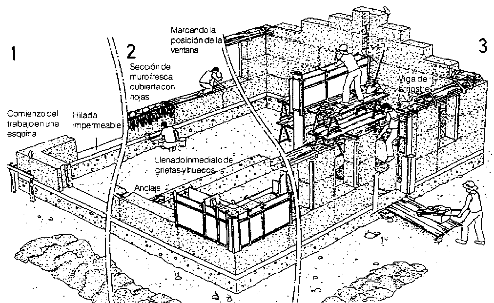 Se llena de tierra un encofrado en capa de hasta 10 cm y se compacta a un espesor de 6 - 7 cm. con el pisón. Cuando el encofrado se llena se desmantela y se se mueve (generalmente en sentido horizontal) a la posición siguiente, se fija firmemente a una hilada ejecutada con anterioridad. Así la edificación va creciendo lentamente, capa por capa, hilada por hilada.