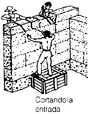 El mortero es distribuido sobre el moro con una llana, cubriendo un largo de aproximadamente 1 m A continuación se colocan 8 a 10 ladrillos, alineados por el cordel, llenando las juntas verticales con mortero. El procedimiento se vuelve a repetir. Para cada nueva hilada se corre la cuerda hasta la próxima marca.