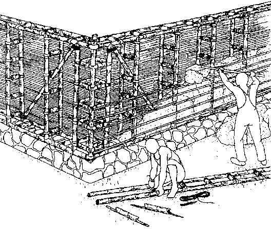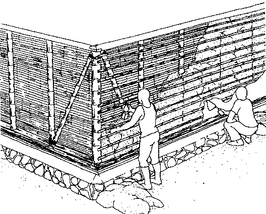 La cubierta exterior de tiras de Bambú se elevan o atan a las escaleras en capas sucesivas para rellenar con el suelo.
