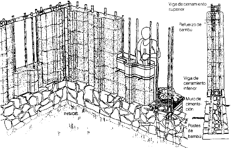 Las esquinas se arriostran diagonalmente. En áreas sísmicas es recomendable que la base de las estructuras descansen sobre el muro de cimentación a través de un mortero suelo-cal.