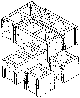 Para la construcción de muros, los bloques son colocados verticalmente con un poco de mortero. Los huecos entre estas unidades verticales son llenadas con concreto 1:3:6 (1 cemento: 3 arena: 6 agregados). Se colocan acero de refuerzo en algunos de los huecos y también se rellena con concreto. En la mayoría de los casos es suficiente llenar solo una cavidad. Los marcos para ventanas y puertas se pueden eliminar porque la forma del bloque le proporciona las jambas necesarias para su fijación.