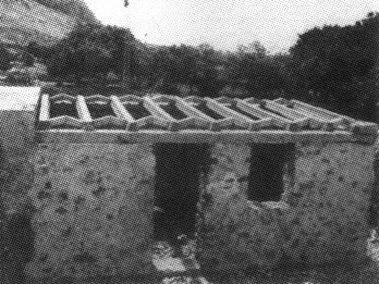 Los techos ligeramente inclinados fueron construidos con vigas de concreto prefabricadas, colocadas con mucha exactitud y en forma paralela, a una distancia suficiente para soportar dos bloques de tierra-cemento apoyados el uno al otro (por lo que los bloques fueron diseñados una de las caras menores biseladas). El par de bloques se unieron con mortero de cal y cemento. Una vez completado, el techo fue cubierto con una lechada de cemento, encima una capa de 5 cm de tierra-cemento compactado, y finalmente una lechada de cal.
