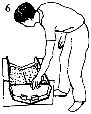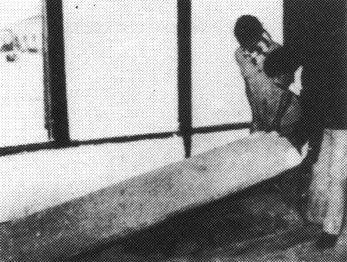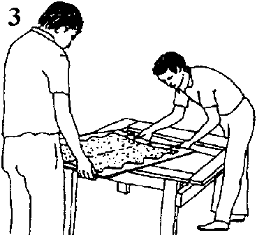 Se retira el marco, recortando las esquinas de la capa de mortero e inclinando la plancha maestra, hasta que la lamina de politeno con el fibrocemento fresco encima pueda resbalar gradualmente sobre el molde corrugado.