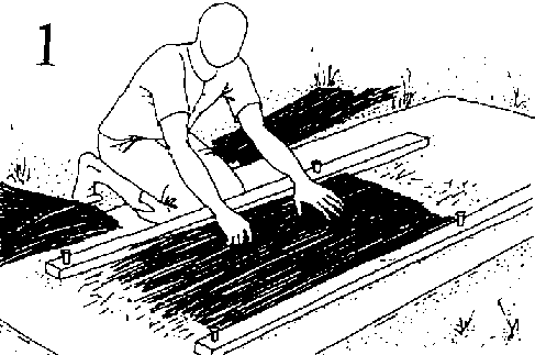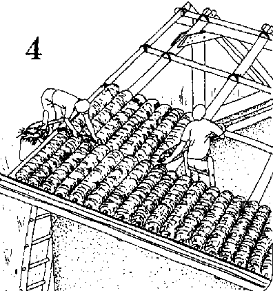 Las bobinas se colocan sobre vigas de madera, cuando están todavía humedas y se presionan las unas contra las otras y rellenan los espacios entre las bobinas con la mezcla de fibra y tierra.