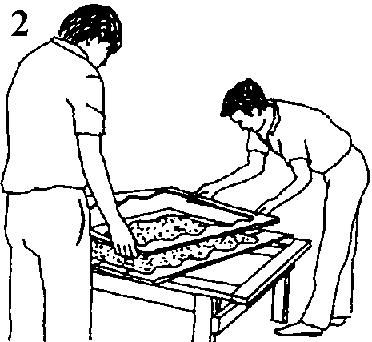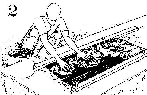 El mortero bien mezclado en la proporción correcta es repartido sobre la lamina de politeno, fijada sobre la plancha maestra; el mortero es apisonado, igualado a un grosor uniforme de 10 mm y allanado con la plancha.
