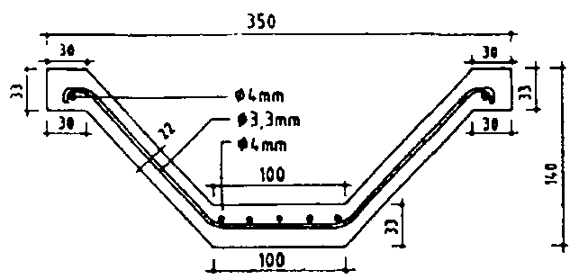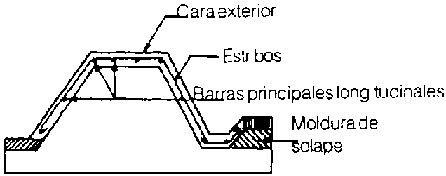 Las dimensiones del corte transversal están indicadas en la siguiente pagina; la longitud usada en el proyecto es de 4.27 m, resultando un peso total de 107 kg. (o 25 kg/m). La armadura se compone de 7 barras de acero de 4 mm en el sentido de su longitud y de estribos de barras de acero de 3.3 mm cada 30 cm. Los elementos son autoportantes, tienen una luz de 3.50 m, con un voladizo a cada lado de los muros.