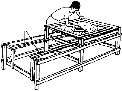 Materiales y equipo: como para sábanas, pero forma de molde diferente, plancha maestra con bisagras, permitiendo ser plegada y ser usada como molde de fraguado, sujetada por una plantilla.