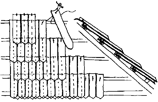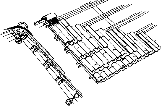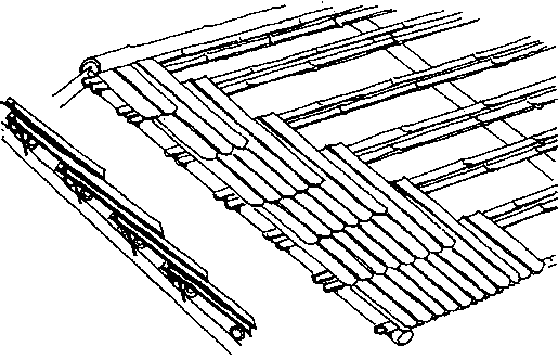 En el caballete se atan dos tejas y se cuelgan a ambos lados. El hueco del caballete se cubre con la mitad de una caña de bambú (la caña se corta por el centro de la sección)