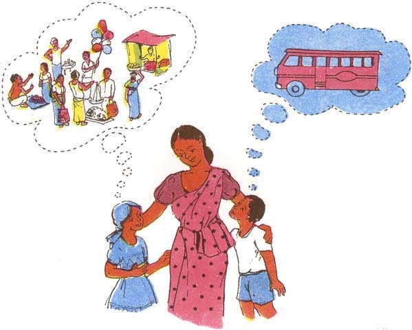The task comprised of an illustration, taken from a reading book in for ten year old children in Sri Lanka - Lets Go to the Fair. The illustration is of a mother and her two children buying fruit from a fruit stall. The selected students were to look at the illustration and talk about it.