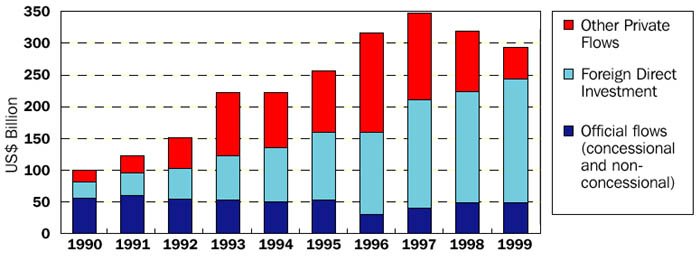 150. A central feature of globalisation has been the substantial increase in movement of capital around the world. Foreign direct investment (FDI) to developing countries increased from US$36 billion in 1992 to US$155 billion in 1999, more than three times the level of development aid. But the pattern of these flows is heavily skewed towards the larger and more industrialised of the developing countriesxix.