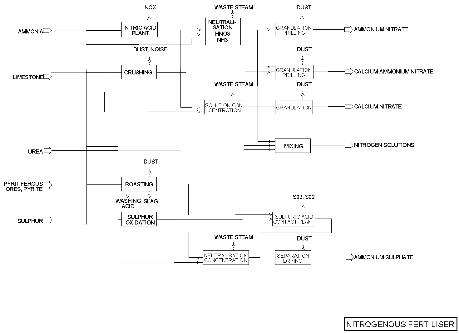In nitrogenous fertiliser production facilities, the implications for the environment concern in the main gaseous waste (dust, ammonia, nitrous gases, sulphur dioxide), and noise, plus, in the case of roaster installations, process-specific by-products and residues.