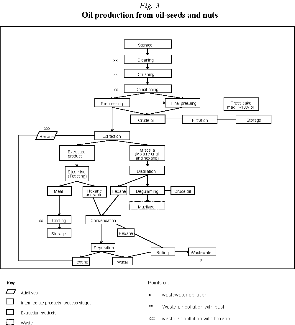Processing produces waste, dust and odorous substances as well as wastewater in a quantity of some 10 m3/tonne seed. Cylinder mills, fans and pneumatic conveyors are also sources of noise.
