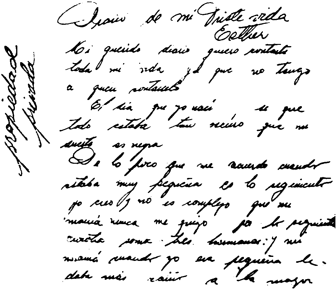 Fig. 2.- Los "diarios" de los adolescentes, encontrados con sorpresa por los padres y muchas veces llevados al profesional como motivo de consulta, constituyen expresión de su ensimismamiento y magnífica fuente para conocer sus problemas socioafectivos. Por ejemplo, esta parte de una página de un "diario": " Propiedad privada. Diario de mi triste vida. Esther. Mi querido diario quiero contarte roda mi vida ya que no tengo a quien contárscelo. El día que yo nací sé que todo estaba tan oscuro que mi suerte es negra... Yo creo y no es complejo que mi mamá nunca me quiso... y mi mamá cuando yo era pequeña le daba mas cariño a la mayor..."