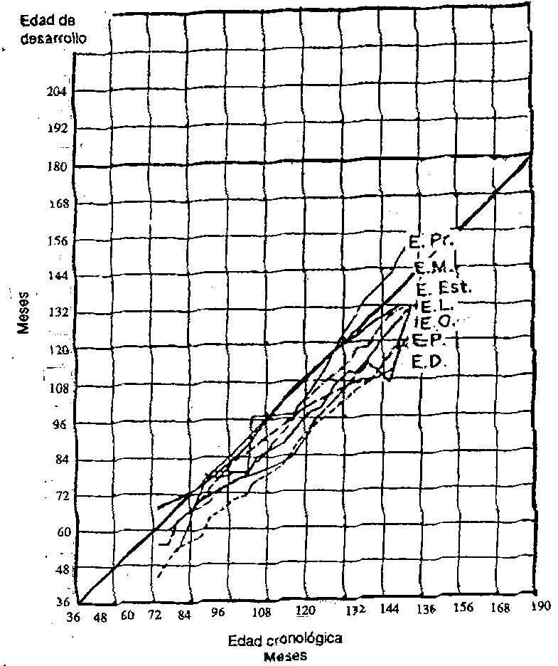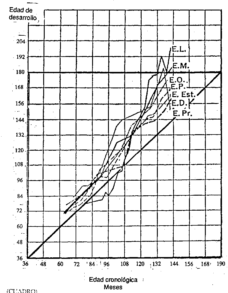 Fig. 5 La correlación de la edad en lectura (EL) con las edades orgánicas detalladas en la Fig. se mantiene como cuestión muy interesante, aun en casos en los que todos estos parámetros se mantengan por encima de la diagonal normal de la gráfica del desarrollo de Wilkins (de acuerdo a Olson, v. Bibliografía).