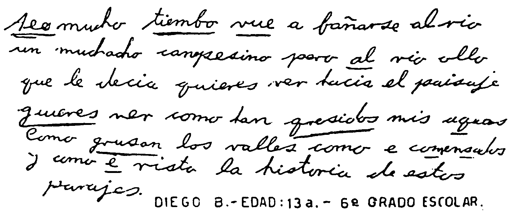 Los déficits en la prueba de escritura fueron siempre de menor intensidad; alrrededor de un grado escolar por debajo del nivel correspondiente. Sin embargo el paciente Diego B. (Caso N° 20), de 13 años de edad para el momento del diagnóstico presentó muy frecuentes errores en su escritura al dictado (Fig. 7).