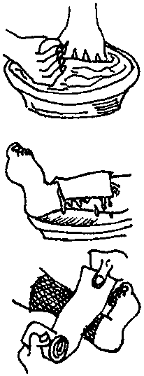 3. Lavar bien la herida con agua hervida entibiada y jabón, usando una gasa o trapo limpio. También lavar la piel alrededor de la herida.