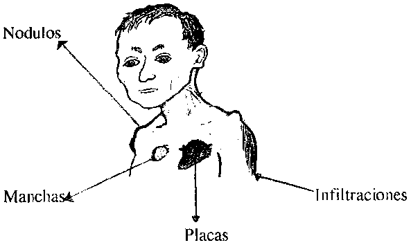 Cuando afecta la PIEL hay 4 tipos de lesiones que se presentan en la enfermedad: