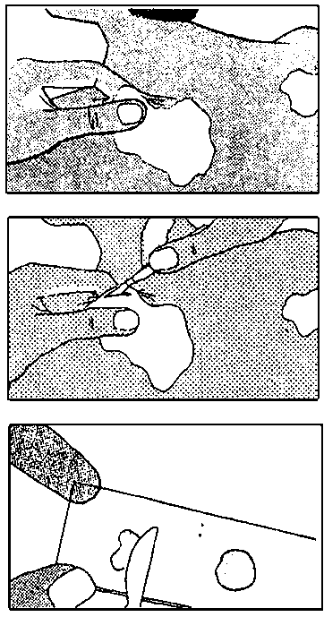 Con la misma punta del bisturí, raspe el fondo y los bordes de la incisión. Recoja linfa y pulpa, manteniendo la presión