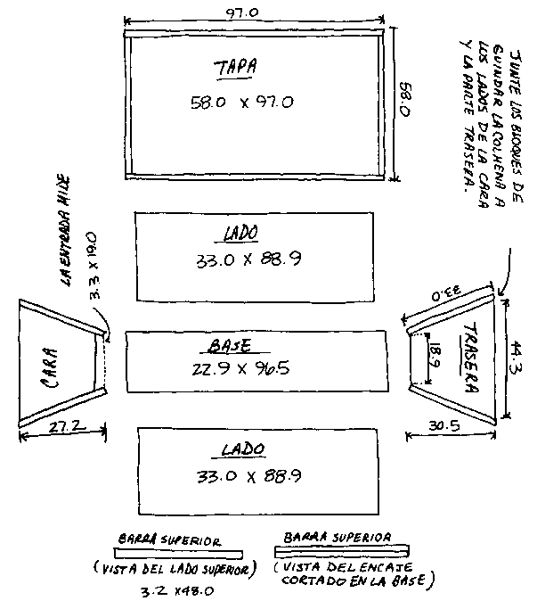 Una colmena de observación (usando madera de 1.9 cm, todas medidas en cm)