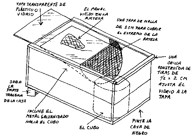 La colmena se puede cubrir con una tapa de las mismas medidas que el fondo, o varias cajas se pueden poner una encima de la otra. Acuérdese de dejar un espacio de tránsito alrededor del cuadro.