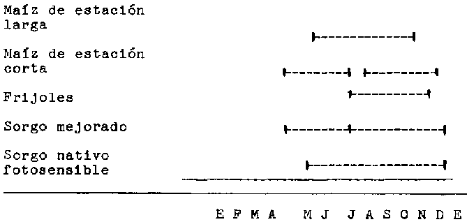 Los ciclos de cultivos se determinan usando el calendario de cultivos (las fechas de la siembra y la cosecha de los cultivos), y están fuertemente unidos a la distribución estacional de, lluvias. Esto se ve claramente en la siguiente comparación de un calendario de cultivos y el cuadro de lluvias de la Figura 1.