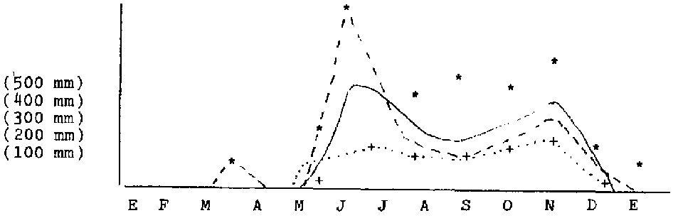 Para interpretar los datos sobre la frecuencia de lluvias de un área de trabajo, es bueno acordarse que los promedios son engañosos. Se deben esperar desviaciones del promedio aunque la gráfica de distribución general estacional mantenga su curva consistente (Figura 1).