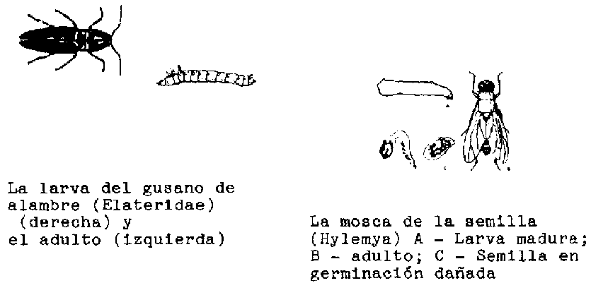 La mosca de la semilla (Hylemya): Las larvas son de un gris amarillento y son de 6-7 mm de largo con una parte trasera obtusa y una cabeza en punta. Atacan a las semillas germinantes, a veces comiéndose el grano entero.